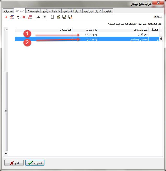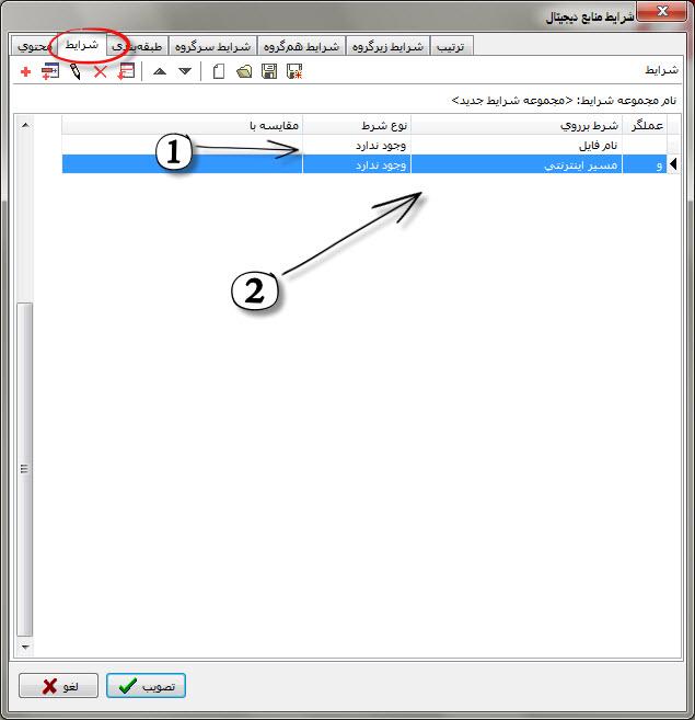 ابتدا وارد منو منابع دیجیتال شده سپس گزینه" اصلاح اطلاعات منابع دیجیتال با اعمال شرایط " را انتخاب کنید و وارد تب شرایط شوید.
