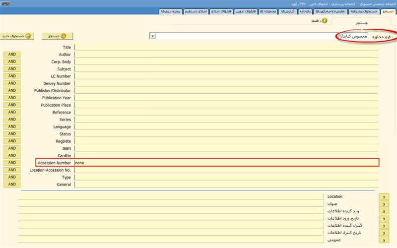 برای مشاهدهی کتابهایی که شماره ثبت ندارند نیز کافیست بعد از اجرای کلاینت سیمرغ و انتخاب پایگاه موردنظر، وارد منوی جستجو شده و فرممحاوره را بهحالت مخصوصکتابدار تغییر دهید.سپس کلمهی هیچ را در مدخل جستجوی شمارهثبت وارد نمایید.
