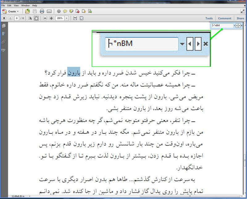 در نمونه‌ی دیگر عبارت بارون را از متن انتخاب و کپی می‌کنیم و در کادر جستجو قرار می‌دهیم، عبارت در کادر به صورت حروف و اشکال نامفهوم دیده می‌شود. در واقع این گونه متون هم به صورت تصویری (image) ذخیره شده‌اند.