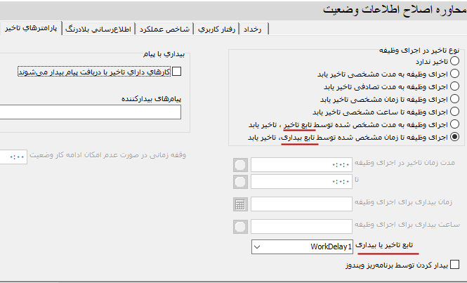 همانطور که مشاهده می کنید، در ناحیه تعیین نوع تاخیر، دو گزینه به استفاده از توابع تاخیر و بیداری اختصاص دارد. در پایین محاوره هم ناحیه انتخاب تابع با خط قرمز مشخص شده است.