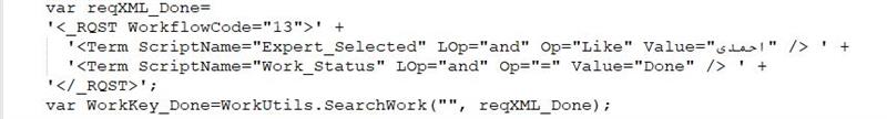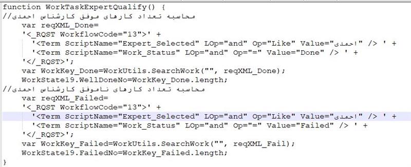 فرض کنید می خواهیم تعداد کارهای موفق و ناموفق کارشناسی به نام احمدی را بازابی کنیم. برای این کار باید در گردش کار 19 (ارزیابی کارشناسان)، تابع SearchWork را در دو مرحله و به شکل زیر بنویسیم: