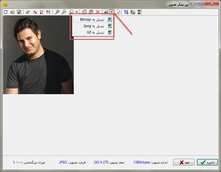 نکته:جهت تغییر فرمت عکس ها وارد گزینه ی ویرایش شوید و از نوار ابزار بالای صفحه آیکنی را که در تصویر مشخص شده است انتخاب نمایید