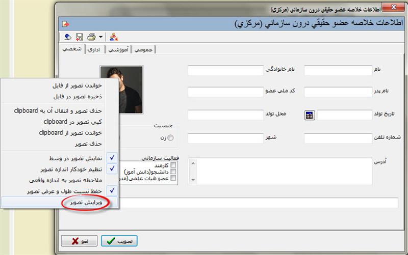 در قسمت سمت چپ فرم، کادر خالی وجود دارد که به منظور اضافه کردن عکس عضو لازم است بر روی آن راست کلیلک نموده وگزینهی خواندن تصویر از فایل را انتخاب نمایید
