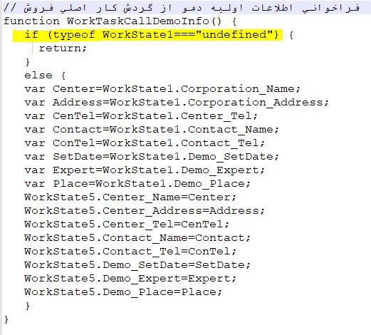 در این مثال، مقادیر تعدادی از فیلدهای فرایند "دمو" یا WorkState5 از فرایند اصلی "فروش بسته ها و خدمات نرم افزاری" یا WorkState1 فراخوانی می شود. بدیهی است که این تابع فقط در حالتی که فرایند "دمو" از درون فرایند اصلی "فروش بسته ها ..." فعال شده باشد، درست کار می کند و در غیر این صورت اگر بخواهیم آن را به شکل مستقل و دستی فعال کنیم سیستم WorkState1 را تشخیص نمی دهد و با پیغام خطایی روبرو خواهیم شد که می گوید WorkState1 تعریف نشده یا not defined است.