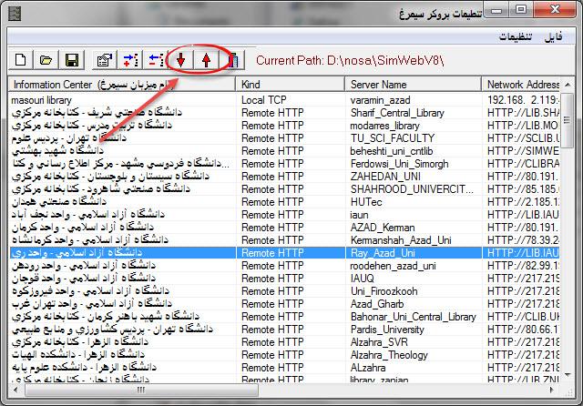 روش دیگری نیز برای تعیین اولویت جستجو وجود دارد،این روش فقط توسط مدیر سیستم قابل انجام است و کاربر عادی دسترسی انجام آن را ندارد،برای این کار وارد نرمافزار Editrslist شده و لیست مراکز اطلاعرسانی را از طریق تکمههایی که در نوار ابزار بالای صفحه قرار دارد و در تصویر مشخص است مطابق نظر خود تنظیم نمایید.در این حالت اولیت جستجو برای همهی کاربران تغییر خواهد کرد.