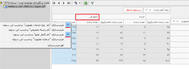 امکان مرتب‌سازی فیلدهای سرجمع در چند سطح، با کلیک راست بر سلول جمع کل فیلدهای سرجمع میسر می‌باشد. گزینه لغو مرتب‌سازی نیز تعبیه گردیده است.