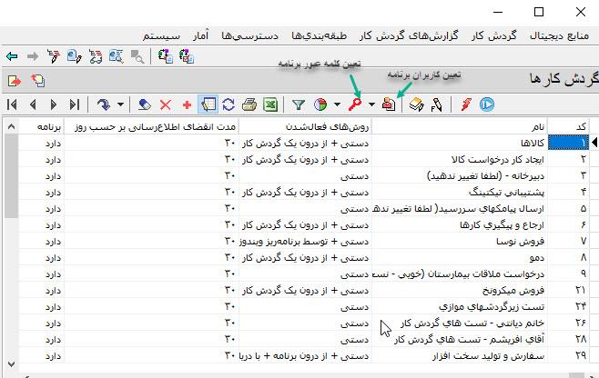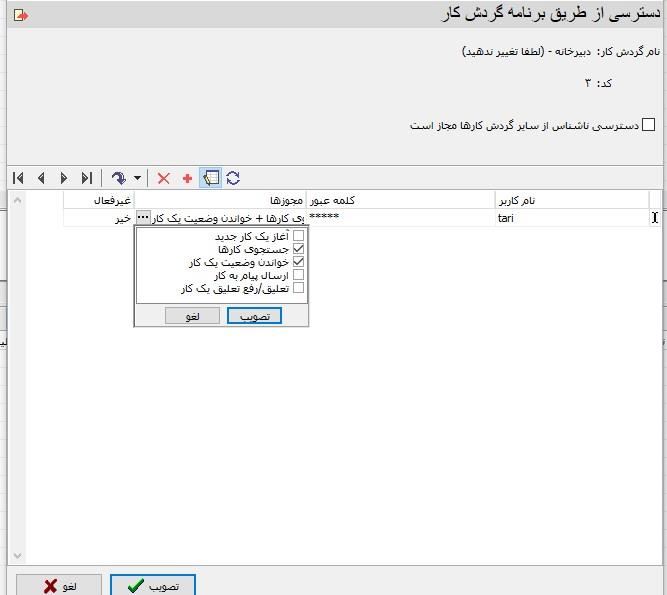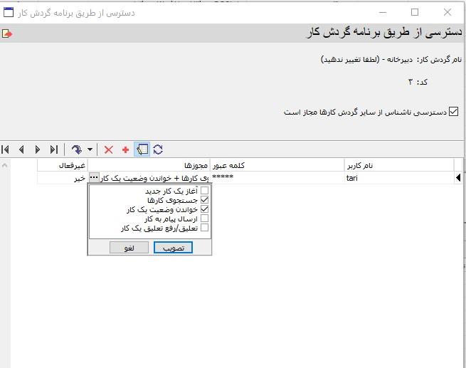 در محاوره گردش کارها، و در قسمت نوارابزار دو آیکون وجود دارد که هریک به نحوی مدیریت دسترسی کاربران به برنامه را انجام می دهند: