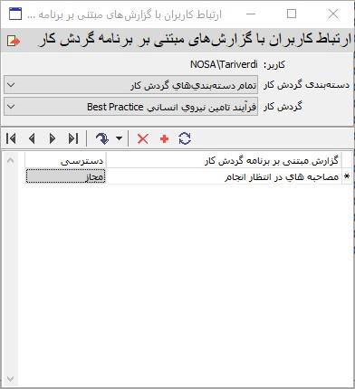 همانطور که مشاهده می کنید در این محاوره باید ابتدا در قسمت "گردش کار"، گردش کار مورد نظر خود را انتخاب کنید و سپس گزارش مورد نظر خود را از فهرست گزارش های مبتنی بر برنامه انتخاب و سپس در ناحیه "دسترسی"، گزینه "مجاز" را انتخاب کنید تا دسترسی کاربر مورد نظر به این گزارش مجاز شود.