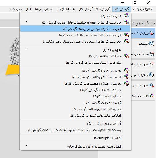 برای مشاهده فهرست کارهای مبتنی بر برنامه کافی است منوی "گردش کار" را باز کنید و از آنجا روی گزینه "فهرست کارها مبتنی بر برنامه گردش کار" کلیک کنید (مانند شکل زیر):