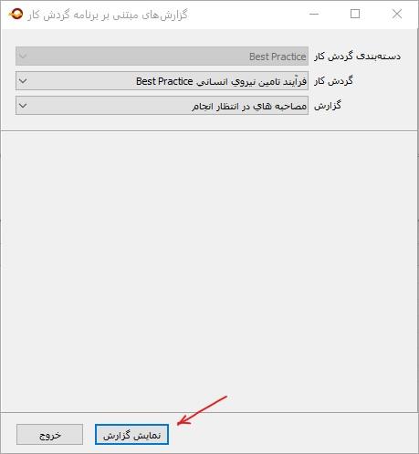 از آنجایی که گزارشهای مبتنی بر برنامه در سطح گردش کار تهیه می شود لذا باید در این مرحه، گردش کار مورد نظر خود را انتخاب کنید. پس از انتخاب گردش کار، گزارش مورد نظر خود را نیز از فهرست گزارشهای موجود انتخاب کنید (شکل زیر):