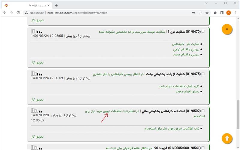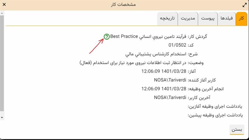 - در برگه انجام کارها، روی وضعیت یکی از کارهای گردش کار مورد نظر کلیک کنید (همانند شکل زیر):