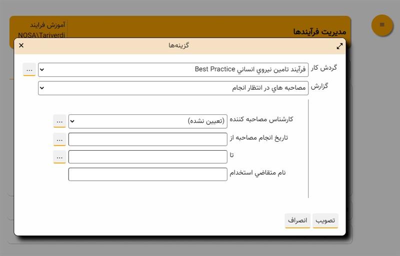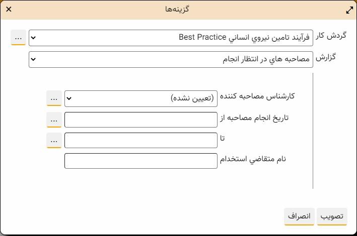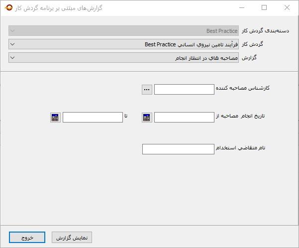 در این محاوره کافی است ابتدا گردش کار مورد نظر خود را مشخص کنید و سپس گزارش مورد نظر خود را از لیست گزارشهای مبتنی بر برنامه انتخاب کنید. به این ترتیب فیلدهای گروه پارامتر تعیین شده نیز در بخش پایین این محاوره به نمایش در می آید. در مثال بالا، فیلدهای گروه پارامتر اطلاعات مصاحبه را مشاهده می کنید. حال می توانید مقادیر مورد نظر خود را در فیلدهای فوق وارد کنید، و در انتها تکمه "نمایش گزارش" را کلیک کنید تا این گزارش تولید و روی صفحه نمایش داده شود.