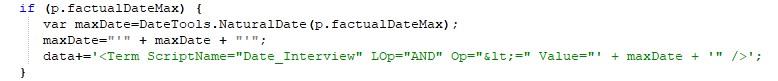 در این قسمت، پارامتر تاریخ مصاحبه_حد بالا (factualDateMax) به عنوان یک Term به فایل xml افزوده می شود. به این ترتیب مصاحبه هایی بازیابی خواهد شد که قرار است تا یک تاریخ خاص انجام شود.
