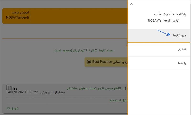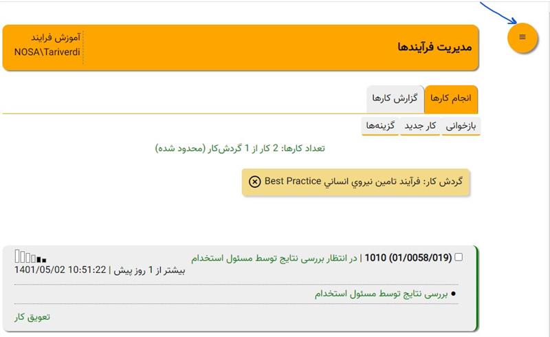 فهرست کارها، در حالت عادی اطلاعات کارهای مرتبط با گردش کار جاری را نمایش می دهد. به عبارت دیگر از داخل یک گردش کار نمی توانیم فهرست کارهای یک گردش کار دیگر را مشاهده کنیم.