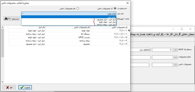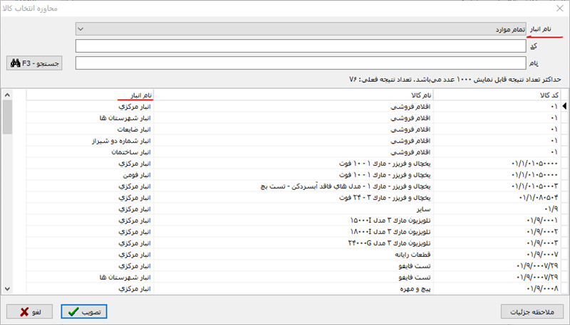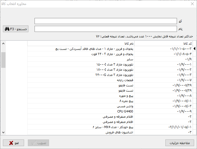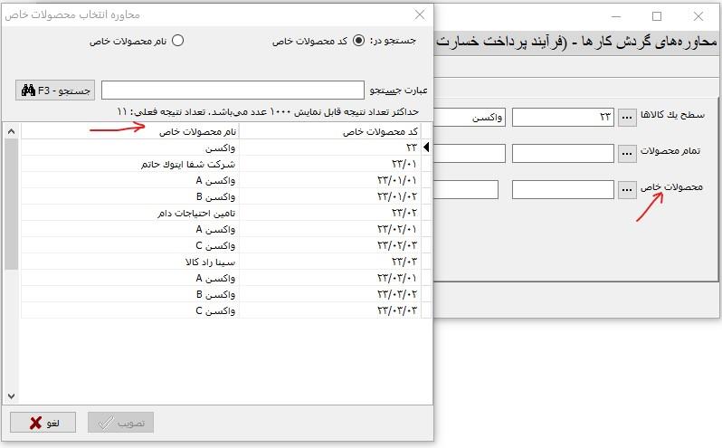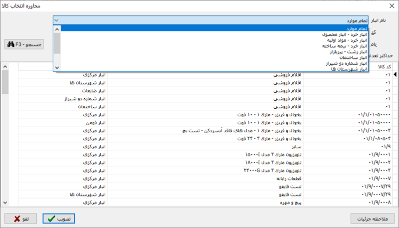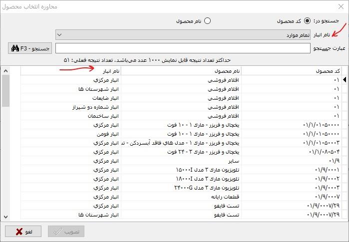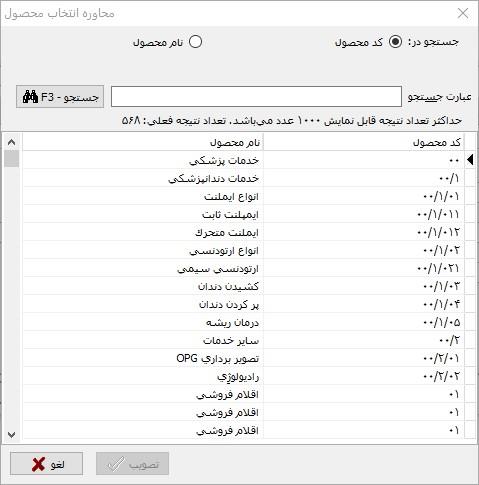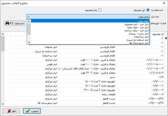 مشاهده می کنید که در این محاوره، فهرست محصولات به همراه کد محصولات نمایش داده شده و کاربر می تواند با انتخاب دلخواه، جستجوی مورد نظر خود را در کد محصولات یا نام محصولات انجام داده و محصول مورد نظر خود را انتخاب نماید.