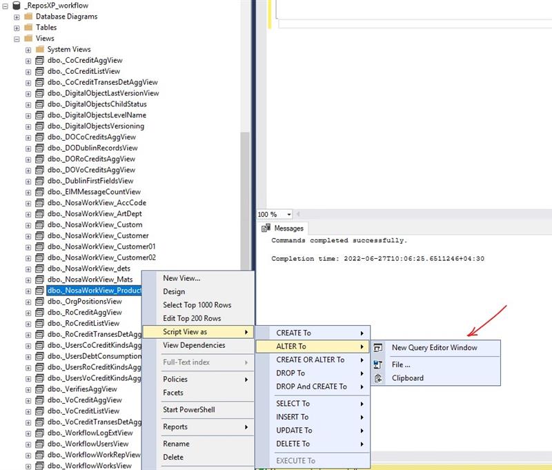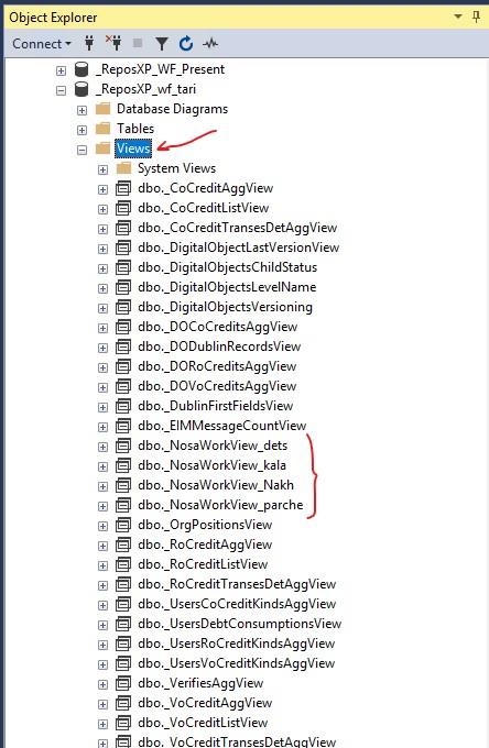 حال کافی است در صفحه باز شده برای Query، و با دستور Create View یک View جدید ایجاد کنید. فقط دقت کنید که نام این View باید با عبارت _NosaWorkView شروع شود. برای مثال به چند View که در این پایگاه تعریف شده دقت کنید (برای دیدن View ها کافی است مطابق شکل زیر، روی آیکون + سمت چپ پایگاه فرایند کلیک کنید تا محتویات این پایگاه نمایش داده شود و از آنجا پوشه Views را باز کنید).