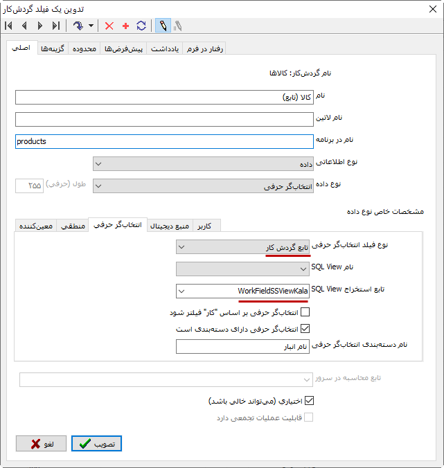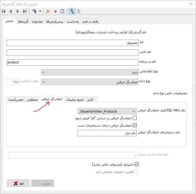نام SQL View : اگر فیلد انتخابگر حرفی از نوع SQL View است در این قسمت فهرست Viewها را باز کنید و از آنجا Viewی مورد نظر خود (در اینجا _NosaWorkView_Products) را انتخاب کنید.