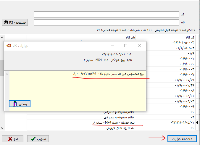 ملاحظه می کنید که اطلاعات شرح کالا، بارکد کالا و قیمت واحد کالای تحت مکان نما، در پنجره جزئیات نمایش داده شده است.