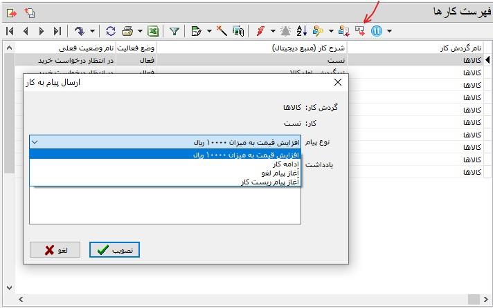 در این مثال، نشانگر روی کار "تست" است و به این ترتیب قرار است که پیام به این کار خاص ارسال شود. حال با کلیک روی آیکون ارسال پیام که در شکل بالا با فلش مشخص شده است کلیک کنیم آنگاه محاوره انتخاب پیام (ارسال پیام به کار) به شکل زیر روی صفحه باز می شود. در این شکل، فهرست کشویی "نوع پیام" باز شده و لیست پیامهای قابل ارسال به روش دستی را نمایش می دهد: