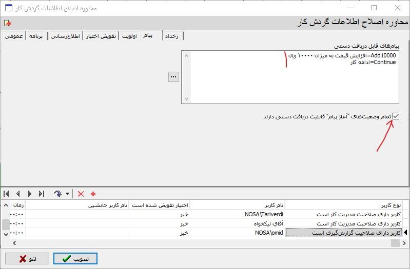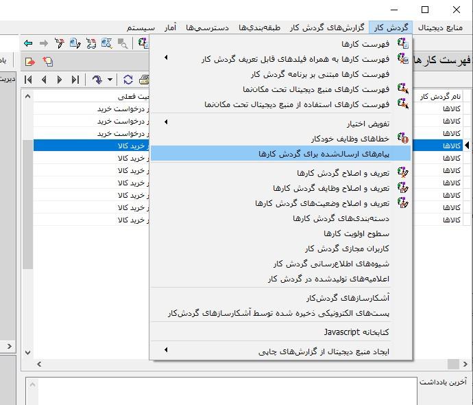 توضیح : دقت کنید که برای این کار ابتدا باید فهرست پیامهای دستی را به گردش کار معرفی کرده باشید. نحوه معرفی پیامهای دستی به گردش کار در ضمیمه 1 با جزئیات کامل توضیح داده شده است.