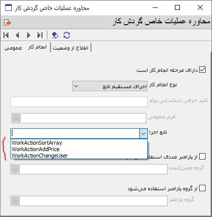 حال باید از فهرست توابع اجرا ، تابع مورد نظر خود را انتخاب کنید. برای مثال در اینجا تابع WorkActionAddPrice* را انتخاب می کنیم که برای افزایش قیمت کالا نوشته شده است: