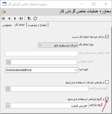 برای اینکه مقدار افزایش قیمت مقدار ثابتی نیست و بسته به شرایط ممکن است تغییر کند لذا این مقدار باید پارامتریک باشد و در لحظه انجام عملیات خاص توسط کاربر تعیین شود. برای این کار همانطور که در شکل بالا هم مشخص شده است، گزینه از گروه پارامتر استفاده می شود را تیک بزنید و از فهرست گروه پارامترهای موجود، گروه پارامتر مرتبط با این عملیات خاص (در اینجا گروه پارامتر افزایش قیمت) را انتخاب کنید.