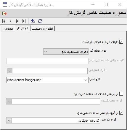 برای تعریف این عملیات خاص، در قسمت تابع اجرا، تابع WorkActionChangeUser را که برای تغییر کاربر مجازی نوشته شده انتخاب کنید.