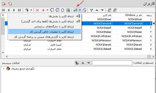 در این سطح، مشخص می شود که کاربر مورد نظر در هر گردش کار به کدام عملیات خاص دسترسی دارد. برای تعیین اختیارات یک کاربر خاص به عملیات خاص، در محاوره تعریف کاربران و امکانات آنها همانطور که در شکل زیر مشخص شده، روی آیکون ارتباط کاربر با بخشها