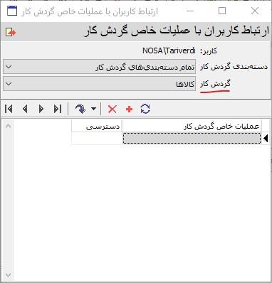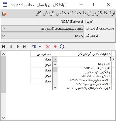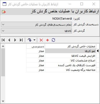 با توجه به اینکه عملیات خاص در سطح گردش کار تعریف و مدیریت می شود لذا در این محاوره ابتدا باید گردش کار خود را انتخاب کنید که در این مثال گردش کار کالاها انتخاب شده است. حال باید در ناحیه پایین محاوره، عملیات خاص مورد نظر خود را انتخاب و دسترسی کاربر را به این عملیات، مجاز کنید. برای این کار روی آیکون