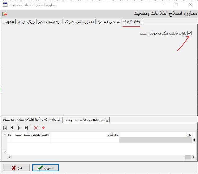 این محاوره دارای برگه (Tab) های متعددی است که برگه آخر رفتار کاربری نام دارد. روی این زبانه کلیک کنید و در این برگه، همانطور که در شکل نشان داده شده، گزینه قابلیت پیگیری خودکار را تیک بزنید. به این ترتیب وظیفه خروجی از این وضعیت، تحت شرایط خاصی بطور اتوماتیک فعال می شود و فرم خاص این وظیفه بلافاصله روی صفحه باز می شود.