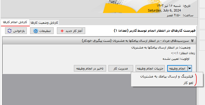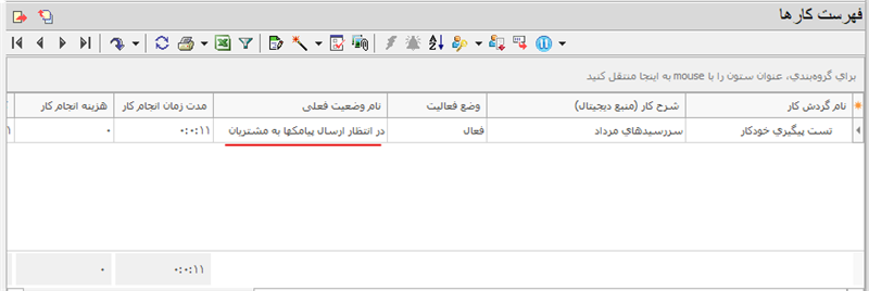- کار در وضعیت در انتظار ارسال پیامکها به مشتریان قرار می گیرد. بدیهی است که وقتی کار به این وضعیت می رسد، تا زمانی که یک کاربر انسانی، اقدام به انجام وظیفه بعدی ننماید، در همین وضعیت باقی خواهد ماند.