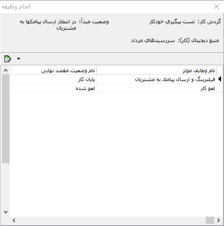 در این مثال، کار به هر دلیل در زمان پیگیری خودکار دچار خطا شده و متوقف شده است. حال اگر اقدام به انجام وظیفه کنیم، سیستم بطور خودکار، سعی می کند فرم اختصاصی وظیفه 1 (فیلترینگ و ارسال پیامک به مشتریان) را باز کرده و کار را ادامه دهد اما چون خطا گرفته است، در این کار موفق نمی شود و مجددا دچار خطا می شود. برای رفع این اشکال و گذر از این وضعیت، آیکون انجام وظیفه (