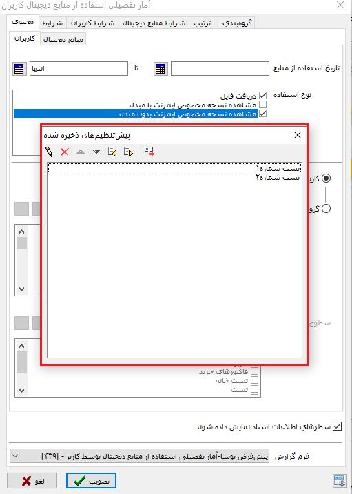 در هر سیستم تعدادی گزارش پرکاربرد وجود دارند که مرتبا با الگوی مشخصی تهیه میشوند که در حالت معمول کاربر لازم است هر بار تنظیمات گزارش را قبل از تهیه گزارش تکرار کند. در نسخه جدید امکان ذخیره مجموعه شرایط و فرم گزارشها به صورت پیشتنظیمهای متداول افزوده شده است.همانطور که در تصویر میبینید با زدن تکمهی پیش تنظیم پارامتر ها :