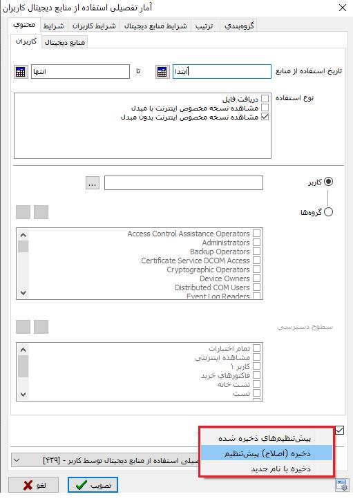 با زدن تکمه ی ذخیره با نام جدید در واقع میتوانیم تمام تنظیماتی که برای تهیه گزارش انجام داده ایم را در قالب نامی دلخواه ذخیره کنیم.