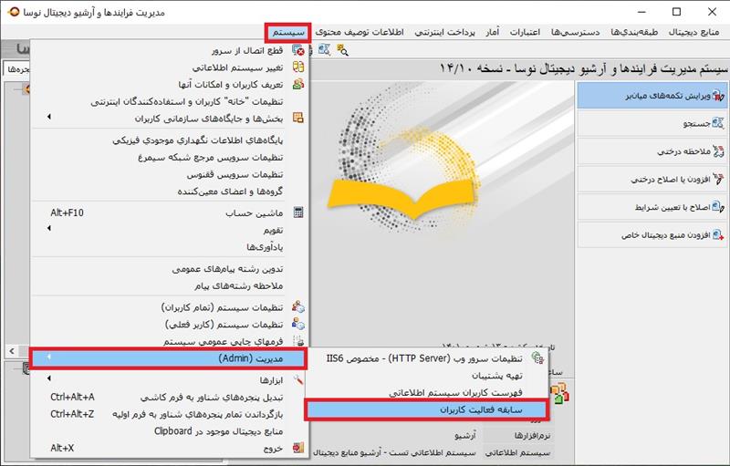 سپس به نرم افزار کلاینت آرشیو متصل شوید از طریق منوی سیستم -> گزینه مدیریت (Admin)، گزینه سابقه فعالیت کاربران را انتخاب کنید.
