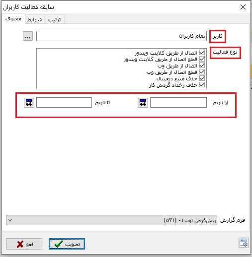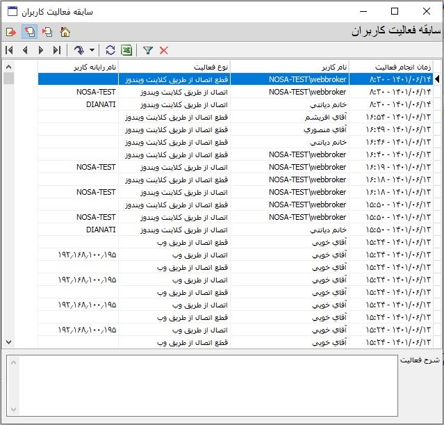 با تصویب پنجره فوق سابقه فعالیت کاربران نمایش داده میشود. در صورت نیاز، امکان حذف سابقه و نیز تهیه فایل Excel از این لیست نیز وجود دارد.