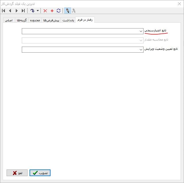 همانطور که می بینید، تعیین محدوده برای فیلدهای عددی، مبلغ، تاریخ، زمان و مدت امکان دارد و برای انواع دیگر از جمله فیلدهای منطقی، و بویژه فیلدهای حرفی، تعیین محدوده امکان ندارد. بنابراین به دلایل گفته شده، نیاز به اعتبار سنجی داریم. حال برای این کار باید در محاوره تدوین یک فیلد گردش کار، برگه رفتار در فرم را باز کنید: