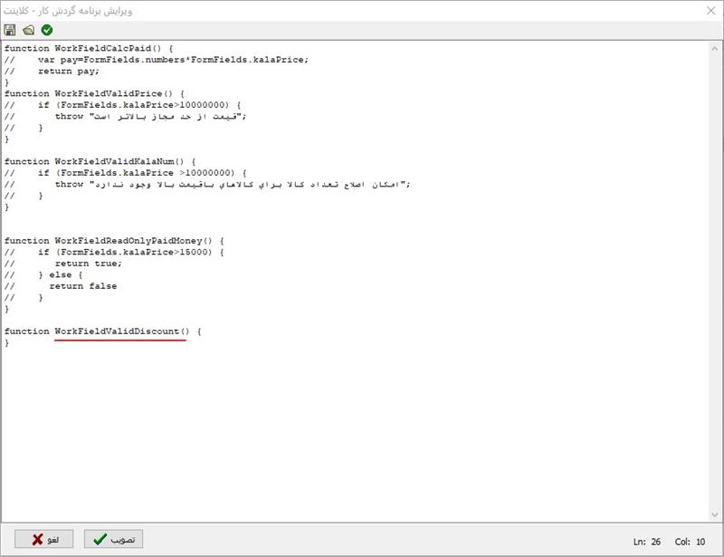 توابع اعتبار سنجی با پیشوند WorkFieldValid شروع می شوند لذا اگر این تابع را قبلا نوشته باشید، در اینجا می توانید فهرست توابع اعتبارسنجی را باز کنید و تابع مورد نظر را از فهرست انتخاب کنید در غیر این صورت می توانید در این ناحیه نام مورد نظر خود (مثلا WorkFieldValidDiscount ) را تایپ کنید و با دبل کلیک وارد محیط برنامه نویسی در کلاینت شوید:
