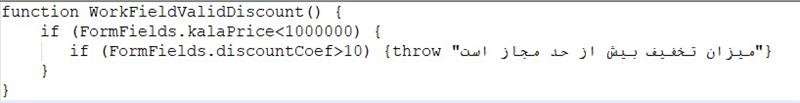 در این تابع تعیین شده است که اگر قیمت کالا از 1000000 ریال کمتر باشد آنگاه تخفیف بیش از 10 درصدر مجاز نباشد. ملاحظه می کنید که در این تابع از فیلد unitPrice که از نوع "محاسباتی در سرور" است استفاده شده است.