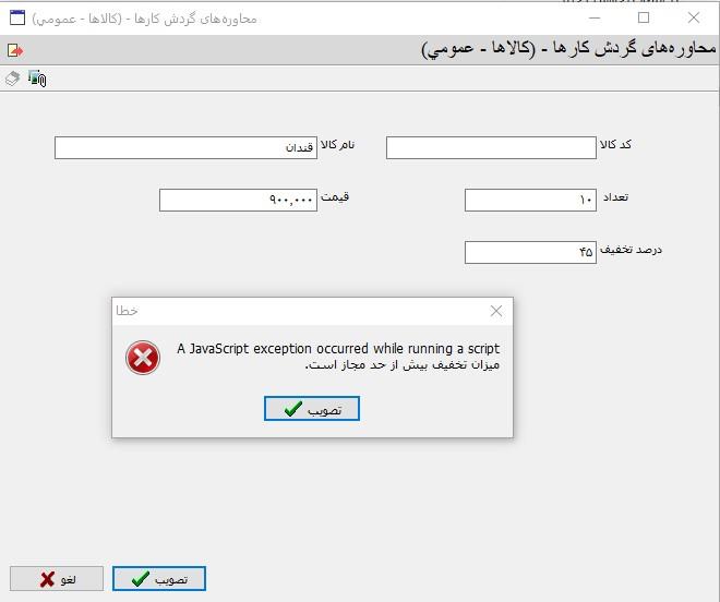 در شکل زیر، مشاهده می کنید که قیمت کمتر از یک ملیون یعنی 900000 است و به دلیل اینکه درصد تخفیف، 45 انتخاب شده، سیستم این مقدار را اعتبارسنجی کرده و بیش از حد مجاز اعلام کرده است: