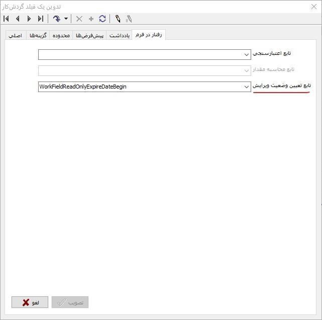 در این فرم، ابتدا نوع اطلاع رسانی مشخص می شود و در میان انواع اطلاع رسانی، فقط گزینه دوم یعنی اعلام سررسید (قراردادها) ست که باید محدوده زمانی سررسید مشخص شود. بنابراین برای انواع دیگر اطلاع رسانی، تعیین محدوده تاریخی بی معنی است و لذا باید در این موارد، فیلدهای آغاز محدوده و پایان محدوده را غیرقابل ویرایش (read only) کنیم. برای مثال برای فیلد محدوده آغاز سررسید و در محاوره تدوین این فیلد، برگه رفتار در فرم را باز کنید و مطابق شکل زیر در ناحیه تابع تعیین وضعیت ویرایش، تابع مورد نظر خود را انتخاب کنید: