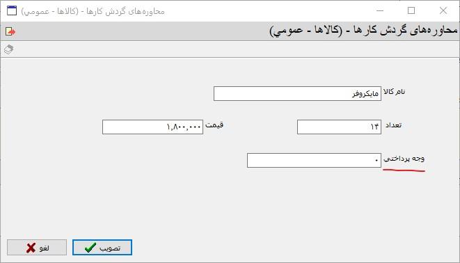 در سطر دوم این تابع، حاصلضرب مفادیر فیلدهای تعداد کالا (kalaNumbers) در قیمت کالا (kalaPrice) در متغیر pay قرار داده شده و این مقدار به عنوان خروجی تابع در فیلد وجه پرداختی نمایش داده می شود. نتیجه این کار را در فرم زیر ملاحظه می کنید: