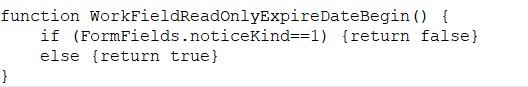 عنوان این توابع با عبارت پیشوند WorkFieldReadOnly آغاز می شود. در این تابع و در سطر دوم شرط نوع اطلاع رسانی (noticeKind) چک شده و تعیین شده که اگر نوع اطلاع رسانی اعلام سررسید *باشد، آنگاه خروجی false باشد یعنی اینکه read only نباشد و در غیر این صورت در انواع دیگر اطلاع رسانی، خروجی تابع true یعنی read only باشد.