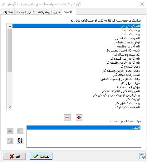هر محاوره گزارش گیری شامل چند برگه است که با تنظیمات این برگه ها می توانیم گزارش مورد نظر خود را تهیه کنیم. برای مثال به محاوره فهرست کارها به همراه فیلدهای قابل تعریف در گردش کار تامین کالاها توجه کنید: