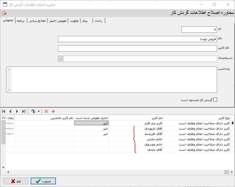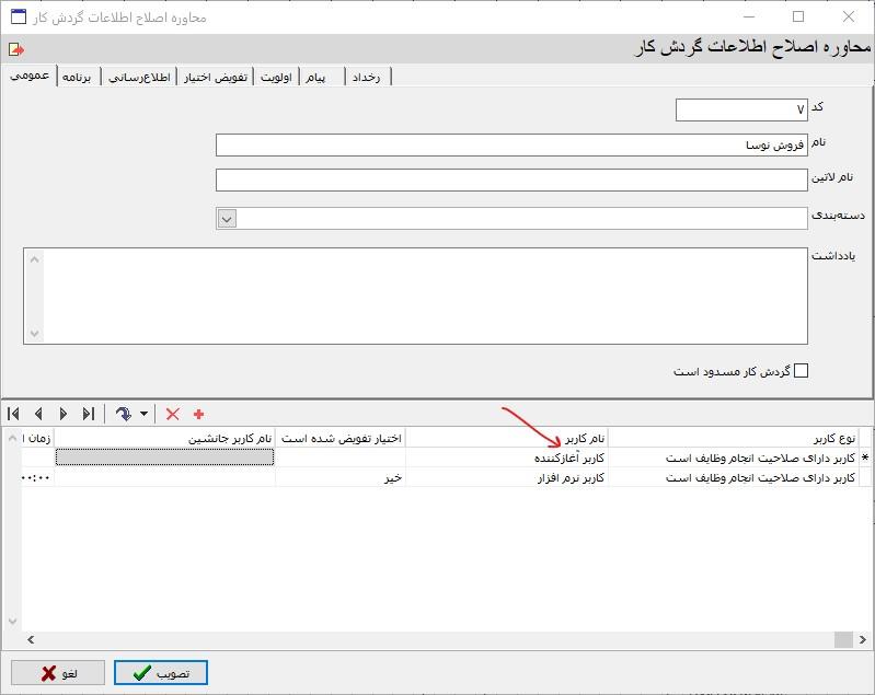 تغییر کاربر: برای مثال فرض کنید که یک کاربر به هر دلیل مثلا مرخصی، قطع همکاری و ... امکان کار با سیستم را ندارد. یا مثلا کاربر مهارت و توانایی انجام این کار را ندارد. در چنین مواردی با این روش می توانید کار این کاربر را به کاربر دیگری محول کنید.