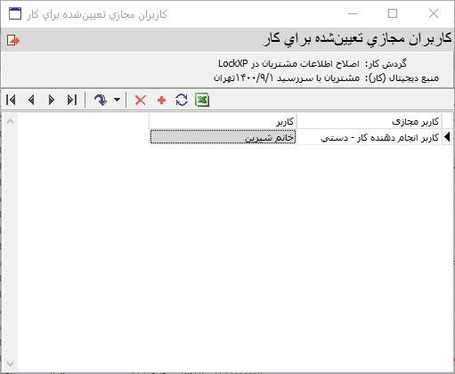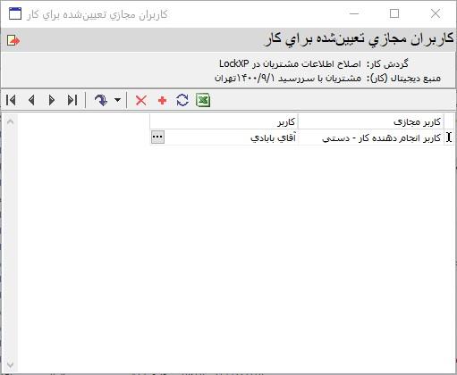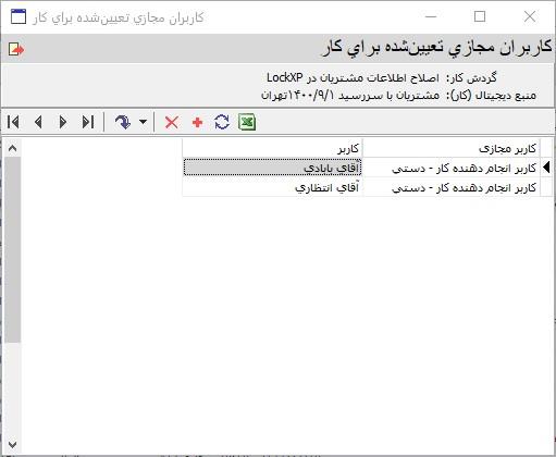 ملاحظه می کنید که در این پایگاه اطلاعاتی، یک کاربر مجازی از نوع تعیین دستی با نام کاربر انجام دهنده کار تعریف شده است که در این کار بخصوص و در این وضعیت (در انتظار خرید کالا) کاربر حقیقی خانم شیرین را نمایش می دهد. حال می توانید محتوای ستون کاربر را تغییر دهید و یک کاربر حقیقی دیگر (مثلا آقای بابادی) را جایگزین آن کنید (شکل زیر):