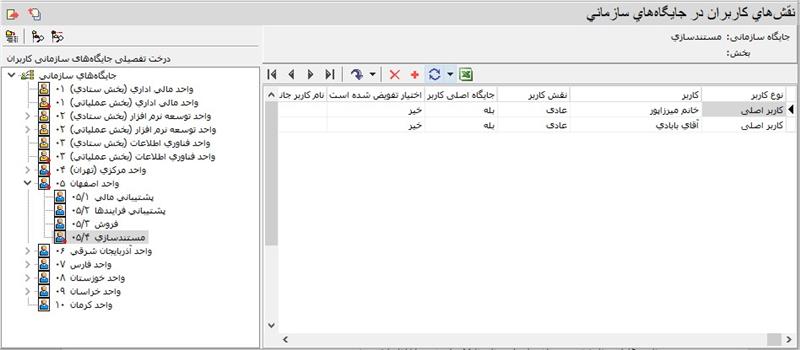 ملاحظه می کنید که در این جایگاه سازمانی (مستندسازی)، کاربر مدیر وجود ندارد بنابراین اگر برای مثال، خانم میرزاپور کاری را آغاز کند، آنگاه مدیر اصلی این کاربر، مدیر جایگاه سطح بالاتر (واحد اصفهان) خواهد بود: