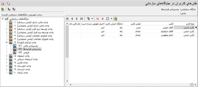 در شکل بالا، کاربران جایگاه سازمانی پشتیبانی فرایندها یکی از زیرمجموعه های واحد مرکزی (تهران) را مشاهده می کنید. در این جایگاه سازمانی، آقای خویی نقش مدیر را دارد بنابراین مدیر این کاربر، در واقع مدیر جایگاه سطح بالاتر یعنی واحد تهران (مرکزی) خواهد بود. در شکل زیر کاربران واحد تهران را مشاهده می کنید: