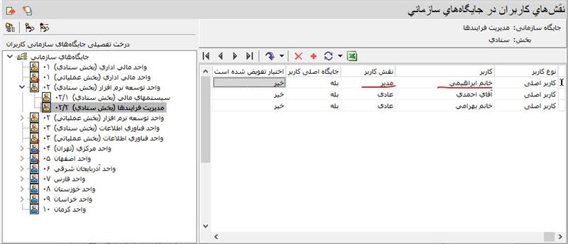 همانطور که در شکل زیر ملاحظه می کنید، در مثال قبلی، یکی از کاربران به نام خانم ابراهیمی نقش مدیر را دارد:
