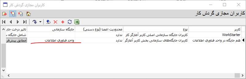 حال، کاربر مجازی هم جایگاه در واحد فناوری اطلاعات، تنها شامل کاربران حقیقی عضو واحد فناوری اطلاعات خواهد بود. دقت کنید که با توجه به نوع این کاربر مجازی (مرتبط با کاربر آغازگر کار)، این مورد، زمانی معتبر است که کاربر آغازکننده کار، عضو این جایگاه سازمانی باشد و در غیر این صورت کاربردی نخواهد داشت.
